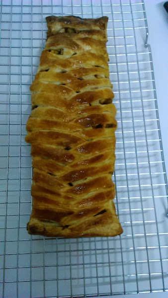 Extender la mezcla en el centro del hojaldre. Cerrar la trenza cruzando alternativamente los cortes de los laterales