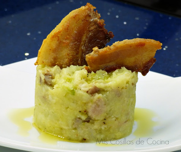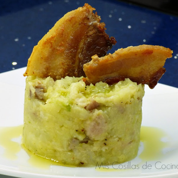 En una sartén con un poco de aceite, sofreímos la panceta cortada en trozos pequeños, salpimentamos, cuando empiece a estar tostada añadimos los ajos picados, cuando tomen color, añadimos la col y la patata y removemos chafandolo a la vez, dejamos tostar y damos la vuelta igual que si fuera una tortilla.