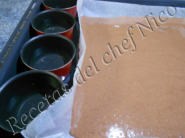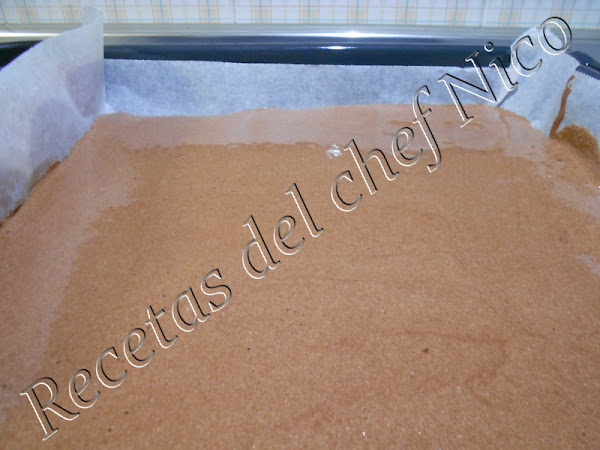5.A parte ponemos en una bandeja de horno de 40 cm. por 35 cm. papel vegetal. Como mi bandeja es más grande he puesto una flaneras con agua para reducir el tamaño y de paso con el agua evitaremos que el bizcocho salga seco.
