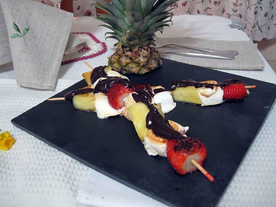 Para cuatro personas necesitarás una piña grande y un par de mangos. Corta en trozos la piña y el mango y coloca los trozos en la brocheta, alternando la piña y el mango. Puedes presentarlos en una fuente adornada con nata y bolitas de chocolate.Imágenes por orden de aparición: ralph and jenny/Flickr; facilisimo.com/Manresa; facilisimo.com/Gulofer; facilisimo.com; facilisimo.com/MERE11.