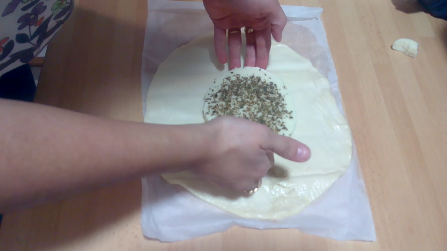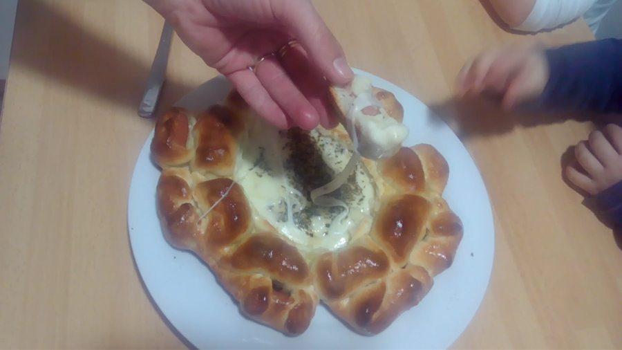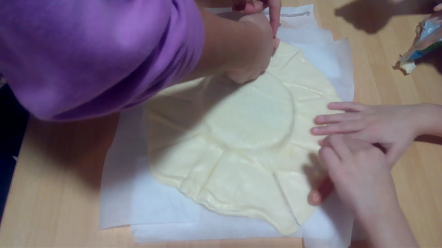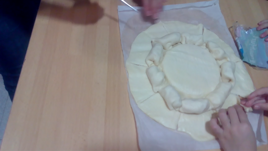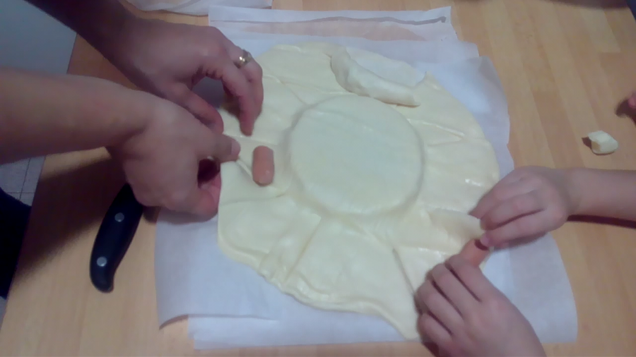 Extendemos una base de pizza ,le ponemos el queso en el centro, cortamos cuatro tiras de papel de horno y colocamos alrededor del queso, para que al cubrir el queso con la otra masa no se peguen las dos, una vez cubierta hacemos cortes en la masa de arriba para envolver los trozos de salchichas(nosotras cada salchicha la hicimos tres trozos) cuando hayamos acabado con la masa de arriba hacemos lo mismo con la de abajo, la pintamos con huevo y metemos en el horno a unos 180º aproximadamente 10 minutos, dependiendo del horno y de como os guste de tostada....
