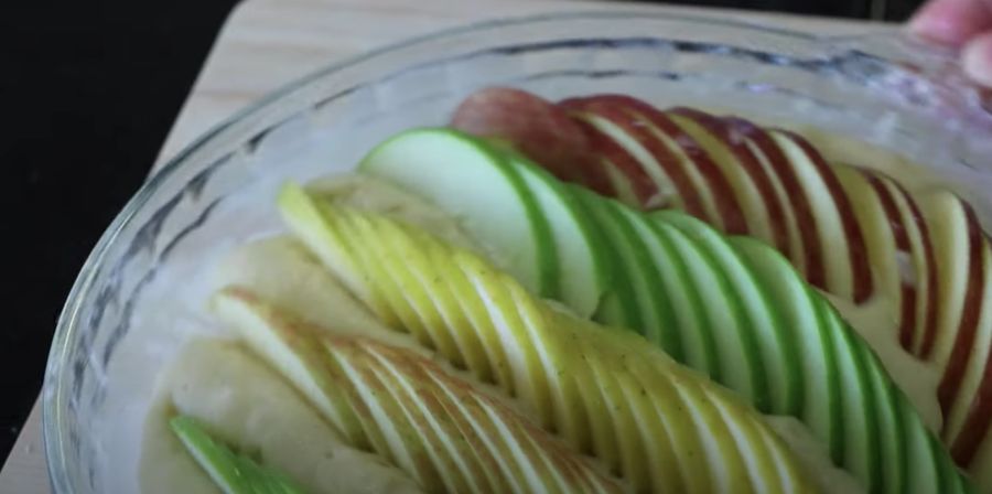 3. Quita el corazón de las manzanas. Cortar por la mitad y cortar finamente. Disponga al azar sobre la masa. Hornea a 180 g durante 40 minutos. Consulte con un palillo. Debe estar seco.