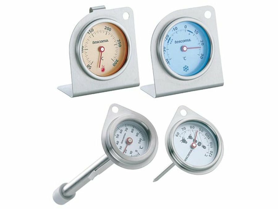 Medir la temperatura de los alimentos es fundamental para hacer los guisos al punto o conservarlos en perfecto estado. Pensando en ello, Tescoma te presenta la gama de termómetros ‘Gradius’. Los dos que puedes ver arriba se pueden meter al horno y al frigorífico. Los otros dos, te permiten medir la temperatura exacta de la carne durante la cocción, así como los grados a los que están ciertos alimentos sólidos y líquidos.