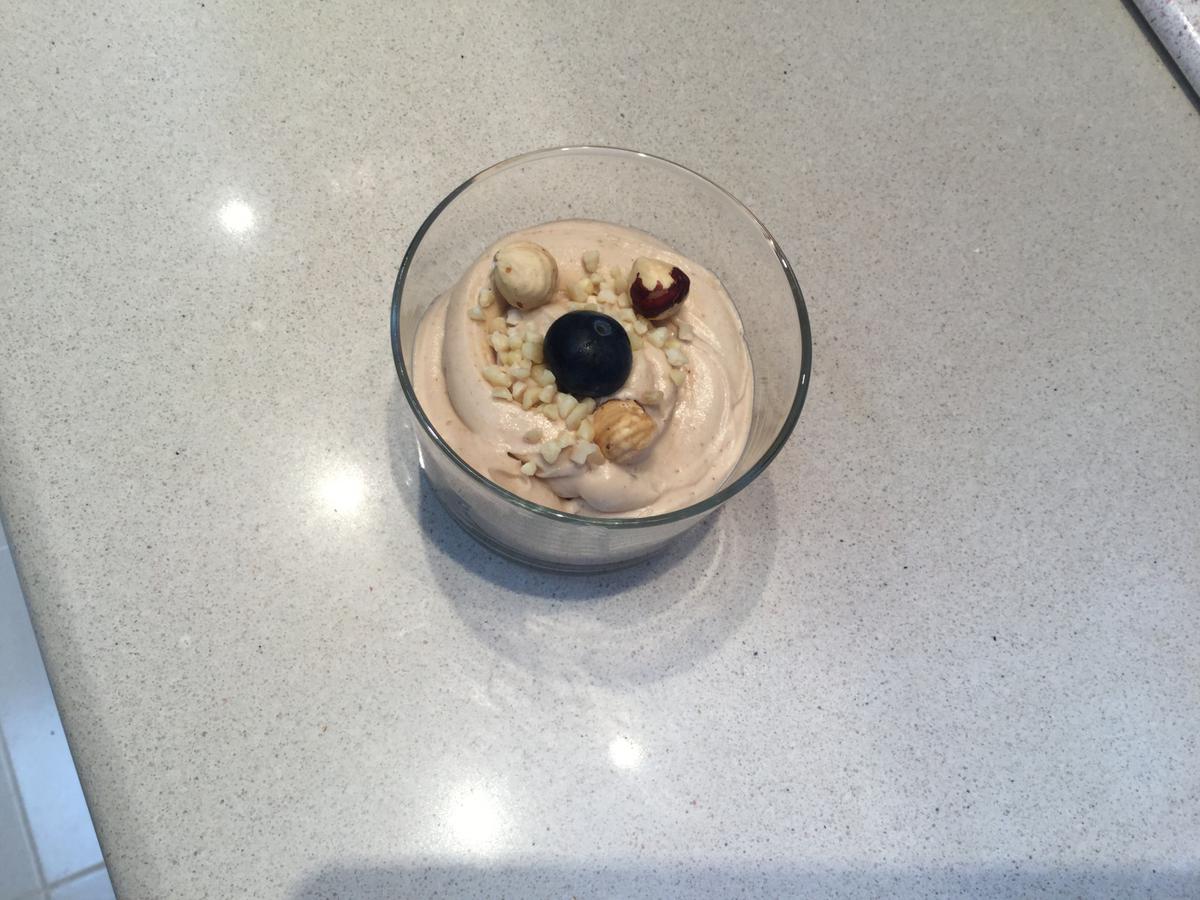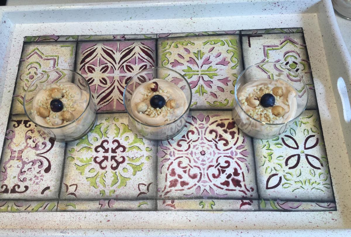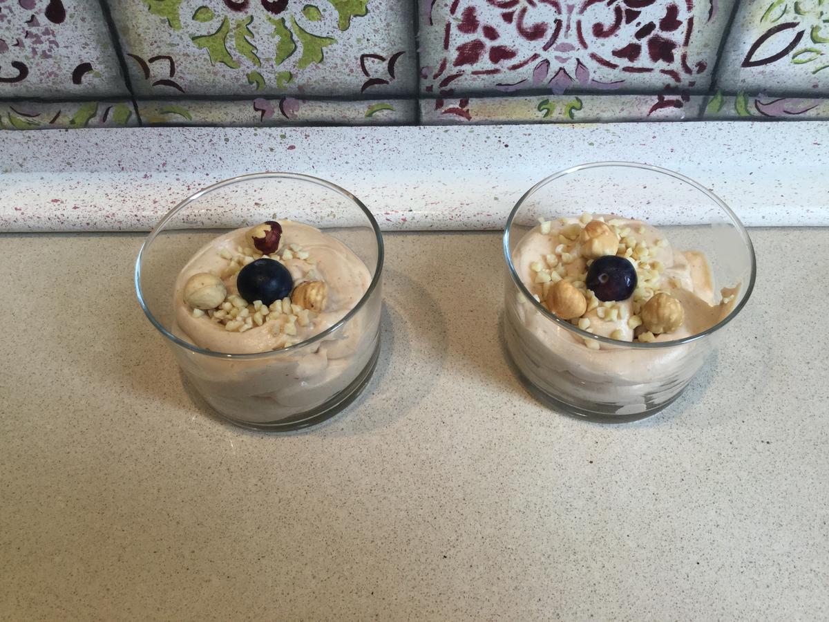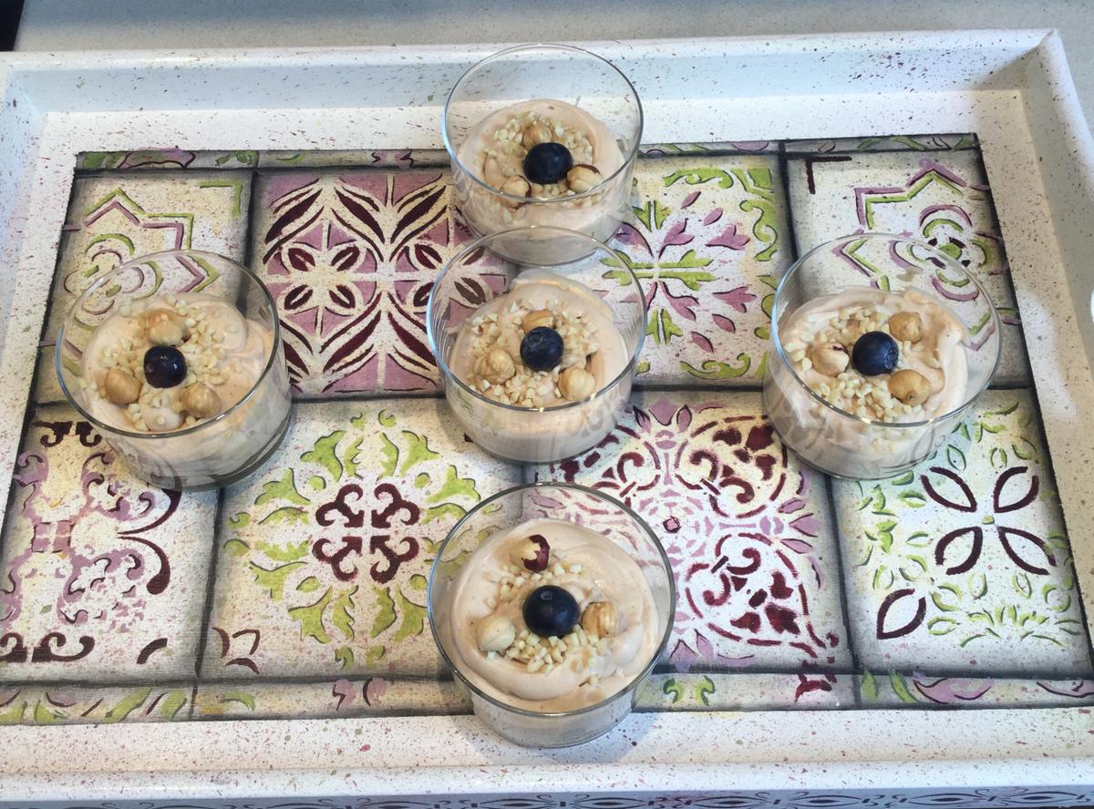 Para decorar, en unos vasitos utilicé una castaña glaseada. En otros, en cambio, unas almendras en cubitos, avellanas tostadas y como no, arándanos para no perder la costumbre de decorar con fruta.