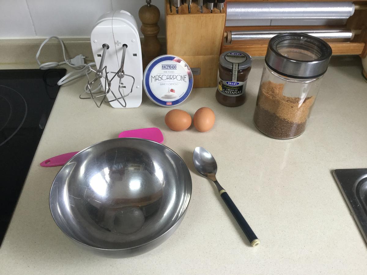 Disponemos todos los ingredientes. Esta receta tiene la particularidad de realizarse un poco a ojo. No hay unas medidas precisas ya que nos va a condicionar la crema de castañas. Dependiendo de la marca que compremos variará su dulzor y con ello modificaremos también la cantidad de azúcar que tengamos que utilizar o bien la cantidad de mascarpone. O bien ambos. Queda al gusto de cada uno.
