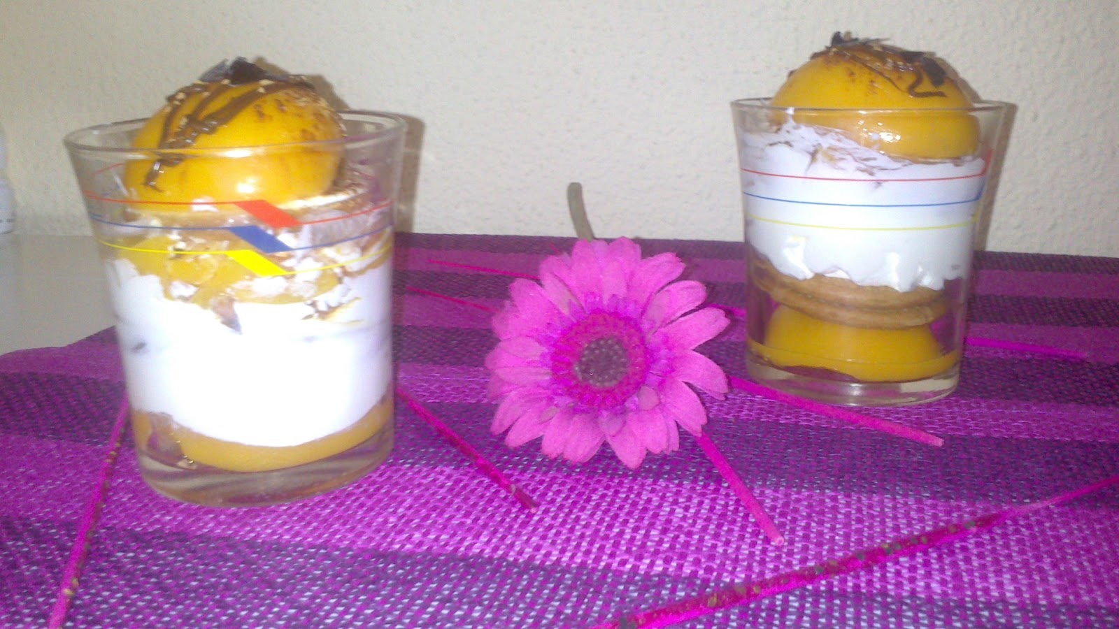 En la base del vaso, ponemos un melocotón en almibar entero, cogemos dos galletas de tipo maría y las mojamos un poco en café, las ponemos encima del melocotón, echamos el queso mascarpone, un poquito de café, una cucharada de café de azúcar y canela en polvo, volvemos a mojar dos galletas maría en café, las ponemos encima del queso mascarpone y encima otro melocotón en almibar entero, espolvoreamos canela sobre él y virutas de chocolate.