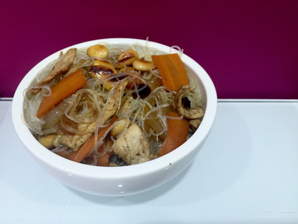 Ponemos los fideos en un bol grande. Los cubrimos de agua hirviendo y los dejamos en remojo durante 15 minutos. Escurrimos y reservamos. Mientras cortamos el pavo en tiras. Cogemos una sartén honda y echamos el aceite, dejamos calentar. Machacamos los ajos con el pellizco de sal y se lo añadimos al pavo. Lo echamos en la sartén y sofreímos aproximadamente durante tres minutos o hasta que el pavo esté hecho. Añadimos los huevos en crudo y revolvemos rápidamente para que se vaya cuajando, añadimos las cebolletas troceadas finamente y dejamos freir unos minutos más, dando vueltas de vez en cuando. Incorporamos el azúcar, la soja y sofreímos un minuto más. Agregamos los fideos, bajamos el fuego y dejamos que continúe la cocción, sin dejar de remover, de 4 a 5 minutos. Para servirlos los ponemos en boles individuales o en una fuente grande y espolvoreamos con el cilantro picado, debemos llevarlo enseguida a la mesa. El cilantro le da un toque especial a este plato, si les gusta podéis echarle un poco más del indicado en los ingredientes.