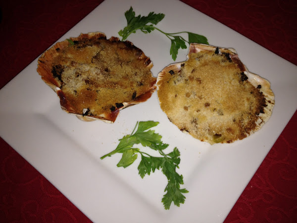 Vieiras cebolla jamón crudo perejil tomate aceite pan ralladoFuente: LECHUZA