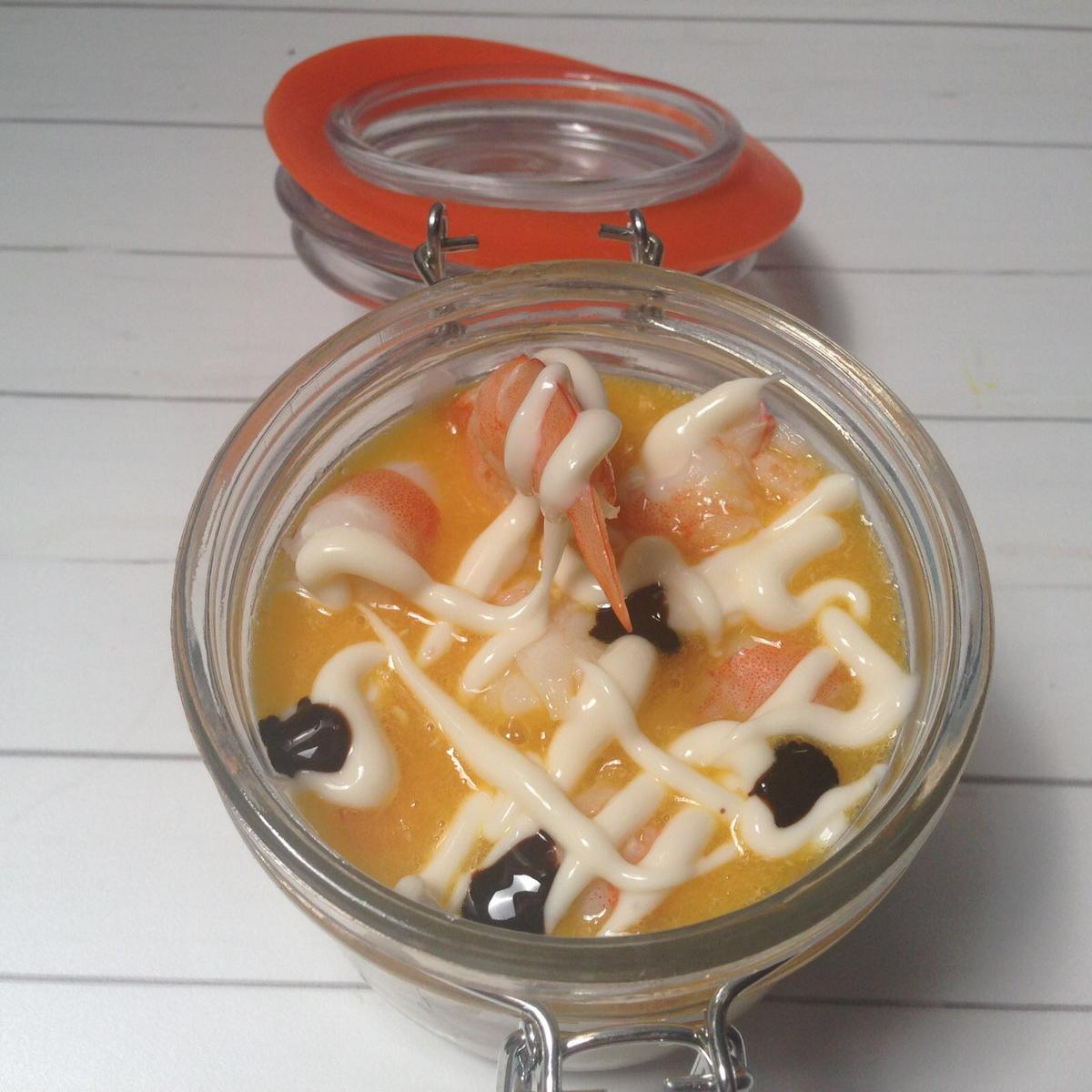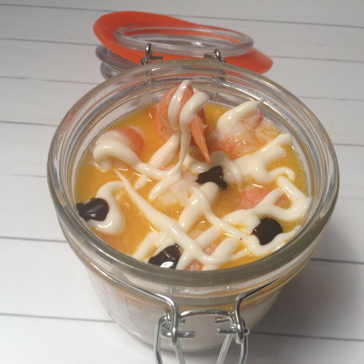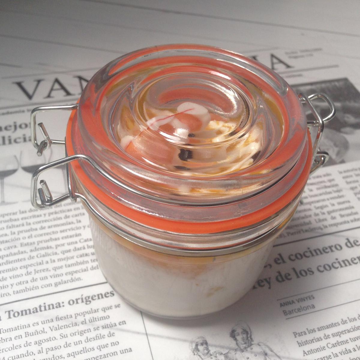 Luego le pongo una capita fina de mayonesa, seguidamente le voy incorporando un culis de naranja y ya para terminar le introduzco unos daditos de naranja y unas gambas, previamente cocidas y frías, que pueden ponerse en trocitos o enteras, eso ¡cómo más os guste!