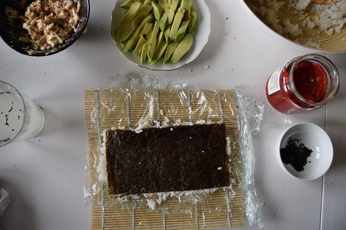 9. Con ayuda del plástico que habías colocado debajo da la vuelta al conjunto de manera que el alga quede mirando hacia arriba y coloca los ingredientes del relleno en el centro. Una tira o dos de aguacate, dependiendo del grosor, una tira de pimiento, y otra de atún con mayonesa. Cuando lo tengas todo listo enróllalo con ayuda de la esterilla. Coge uno de los extremos de la esterilla, envuelve el relleno y aprieta ligeramente para que se asiente y vaya formando el círculo. Es más fácil de lo que parece y si no lo consigues a la primera lo conseguirás a la segunda seguro.