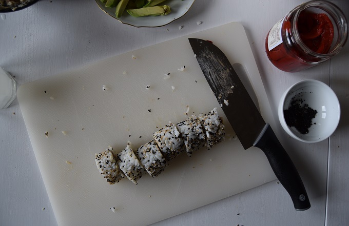 10. Una vez tengas el rollo de sushi formado, córtalo en mitades hasta conseguir 8 rollos y ya lo tienes.