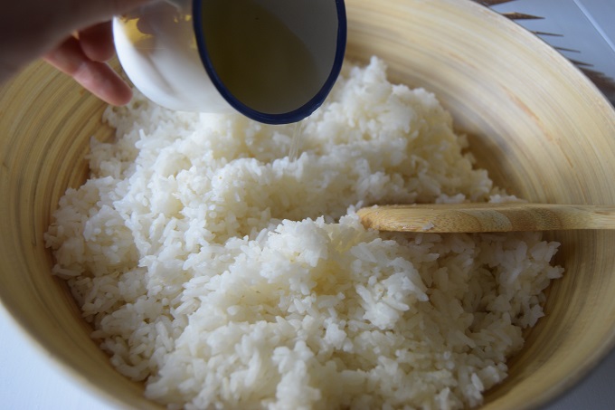 3. Cuando el arroz esté reposado y listo échalo a un recipiente amplio, una ensaladera con mucho fondo o una bandeja, y riégalo con la mezcla de vinagre. Ahora debes separar el arroz con una paleta o espátula de madera. Es importante que lo hagas con cuidado, sin aplastar el arroz y con movimientos horizontales, verticales y/o diagonales pero no circulares. El objetivo es separar el arroz y enfriarlo por eso se suele abanicar hasta dejarlo a temperatura ambiente. Después se tapa con un paño para que no se seque.