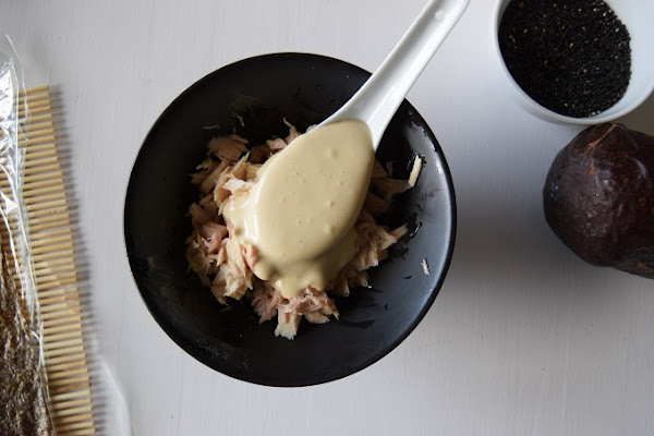 6. Desmiga el atún y mézclalo con unas cucharadas de mayonesa. Reserva.