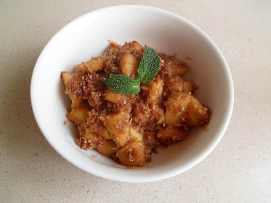 Pon un cazo al fuego, pon a panela y remueve a fuego suave, cuando vaya empezando a oler a tostado, ve agregando agua templada, muy poco a poco sin dejar de remover. Cuando quede una especie de sirope, añade la manzana cortada en dados y remueve durante unos tres minutos, hasta que la manzana vaya quedando un poco blanda por fuera, pero siga crujiente por dentro. Por último, apaga el fuego, incorpora la onza de chocolate rayada, el coco rayado, la canela, y mezcla suavemente para que el chocolate se derrita con el calor que queda.