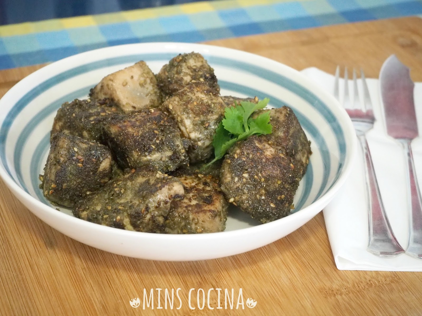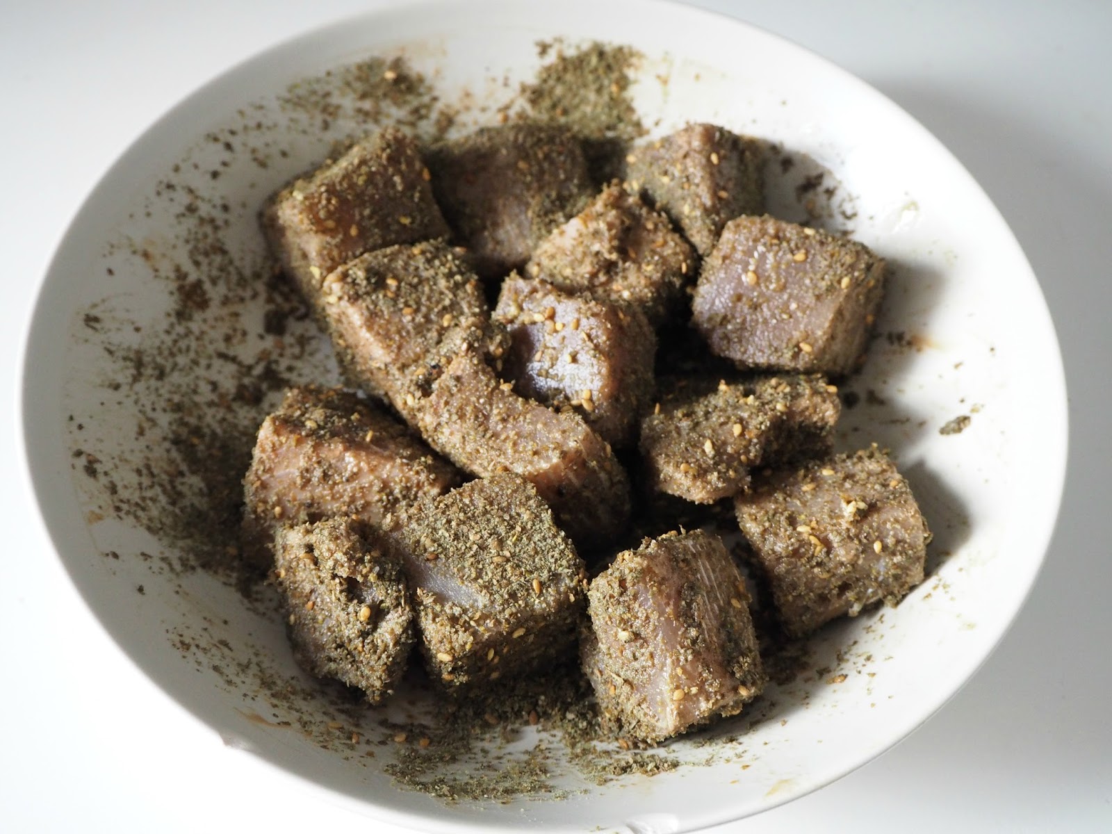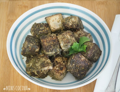 - Ponemos los dados de atún en un plato hondo y añadirle la sal al gusto, la soja, el zumo de limón y el zaatar. Mezclamos bien y dejamos "marinar" unos 10 minutos.