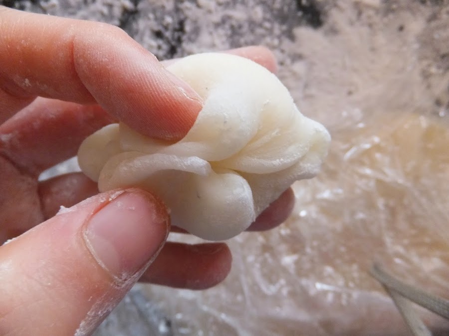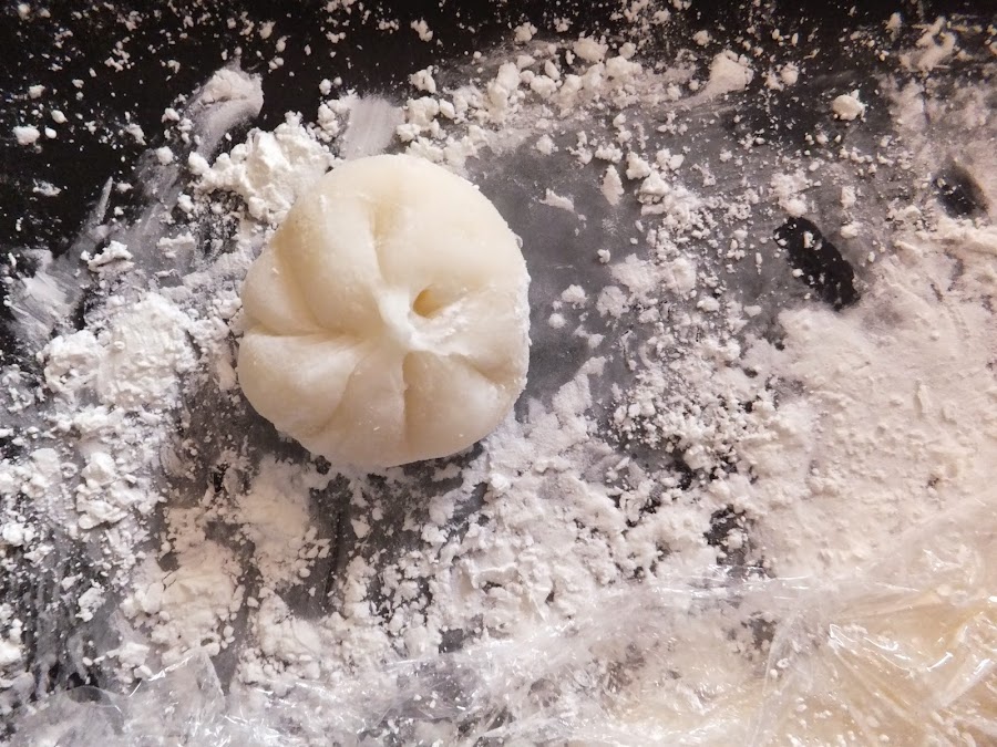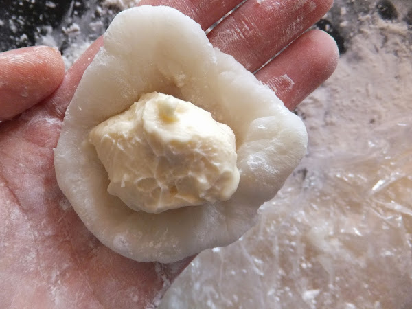 10. Aplana las bolitas, coloca el relleno, frío, en el centro y cubre estirando la masa a su alrededor. Sella la bolita dando pequeños pellizcos con los dedos. (Advertencia: no estires demasiado la masa o se romperá)