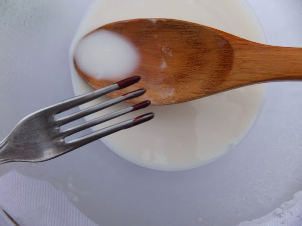 8. Saca el bol y remueve bien la mezcla. Habrá partes aún sin cocinar. Vuelve a meter en el microondas un minuto y medio. Mezcla de nuevo. Debe quedar una masa muy pegajosa, densa y brillante.
