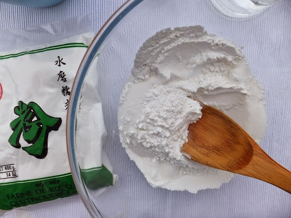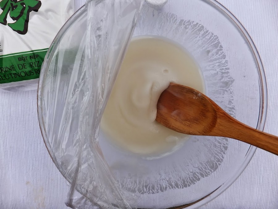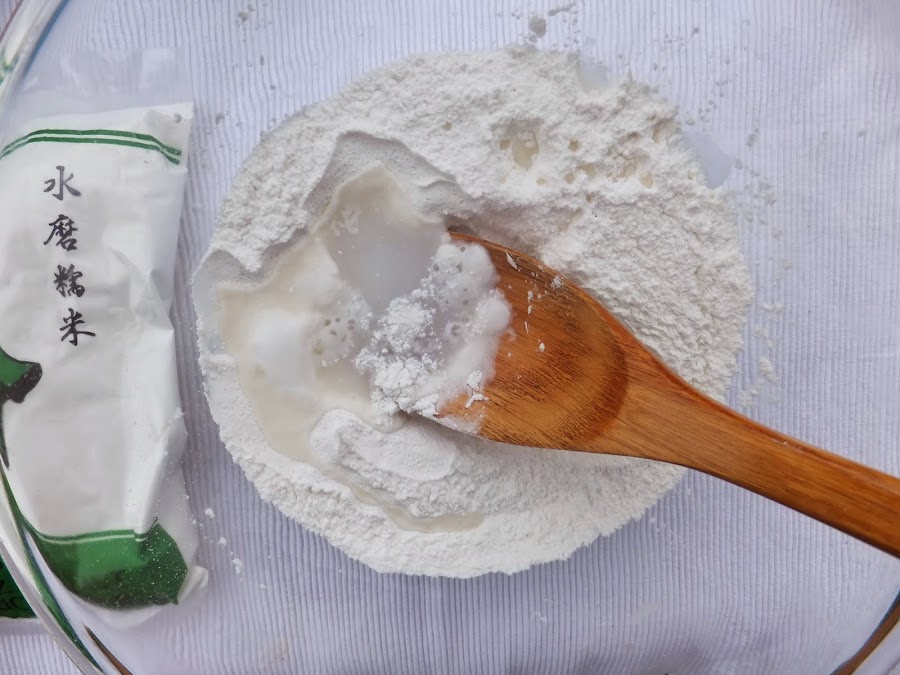 1 parte de harina por 2 de azúcar. (50 gr.de harina de arroz glutinoso, 100 gr de azúcar, 100 ml de agua)