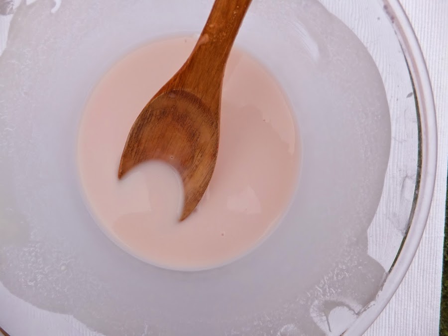 5. Añade el agua poco a poco y removiendo con una cuchara hasta que la mezcla este homogénea. (Si quieres hacer mochis con distintos colores, añade ahora el colorante hasta obtener el tono deseado. Yo he utilizado colorante rojo en pasta)