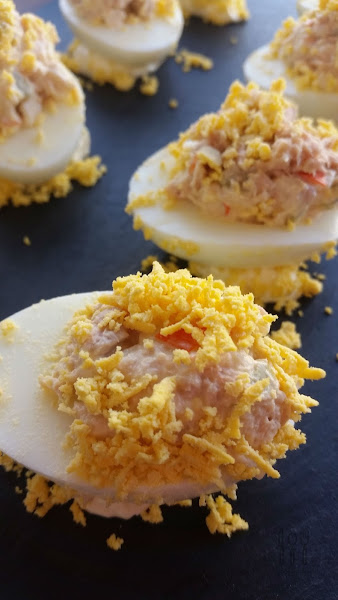 Solo nos queda rellenar el hueco de la yema con nuestra mezcla, espolvorear un poco de yema picada por encima y servir, mejor fríos.