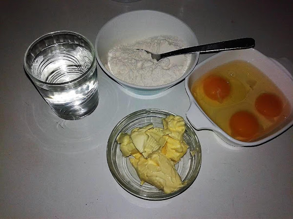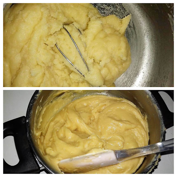 Llevar al fuego la margarina con el agua, cuando rompa el hervor añadir la esencia , retirar del fuego y añadir el harina. Remover, regresar al fuego bajo y mover hasta que se forme una bola. Retirar y enfriar. Agregar los huevos e integrar bien.