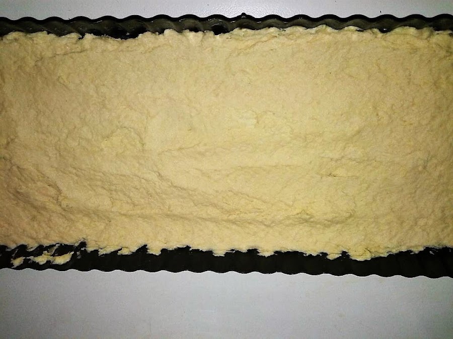 Mezclar todo con un robot de cocina.Formar dos rectángulos de 30 cm por 7 cm o si no utilizar un molde rectangular como guía, así lo hice.