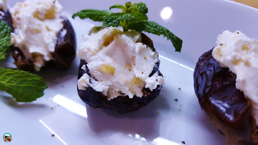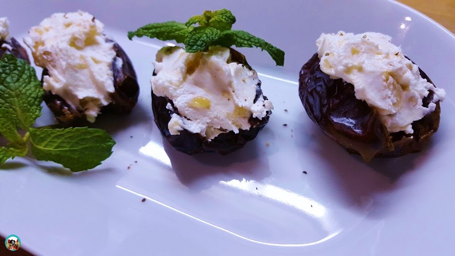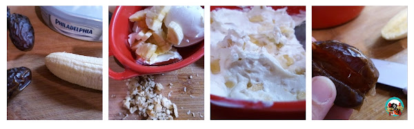 1.- Pelamos el plátano lo partimos en dos mitades, picamos en trozos pequeños una de ellas. Mezclamos los trocitos de plátanos con el queso de untar y un puado de nueces picadas en trozos pequeños. Le quitamos el hueso a los dátiles y los rellenamos con el queso crema que hemos preparado. Le añadimos un poco de pimienta recién molida por encima. Guardamos en la nevera hasta el momento de servir.