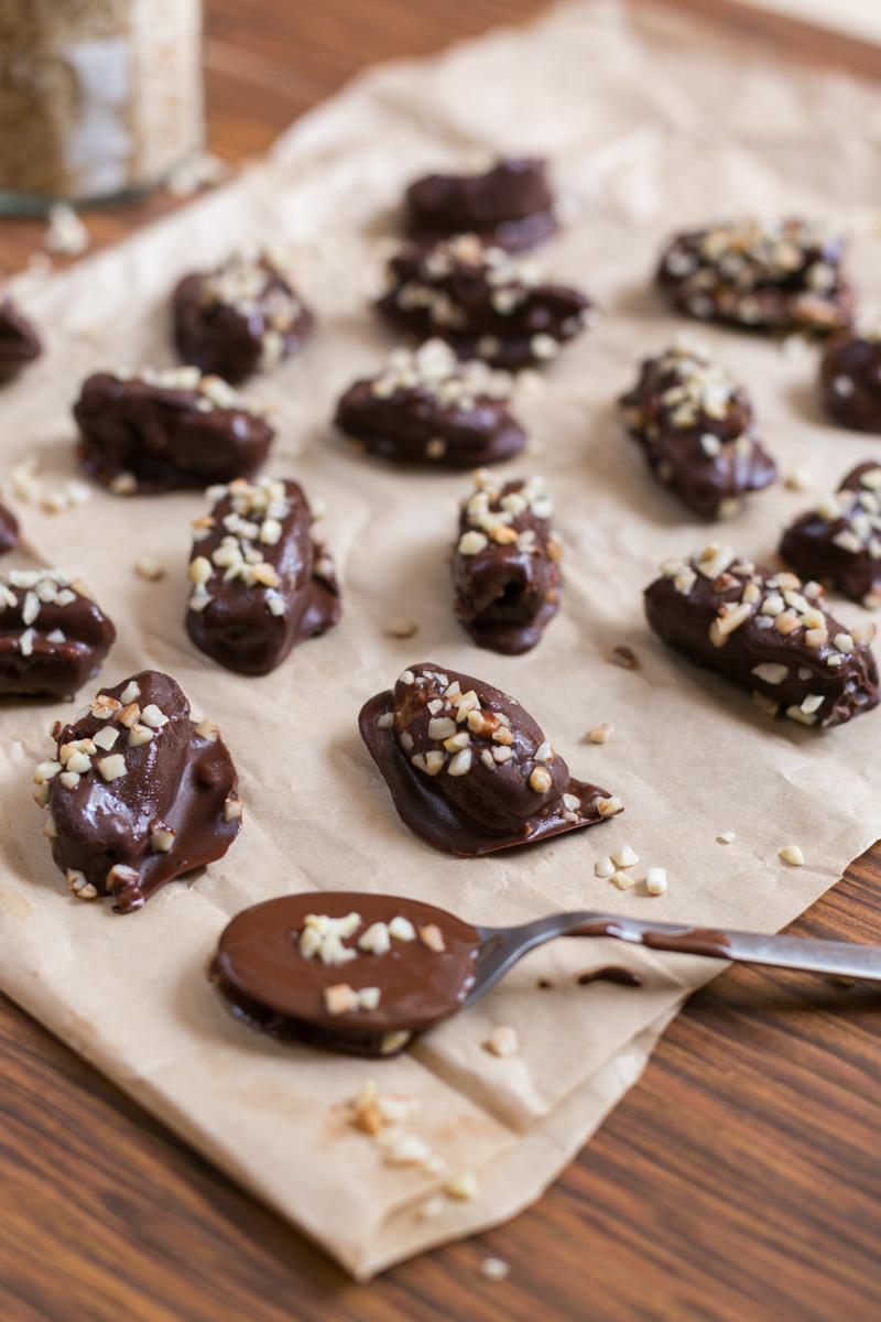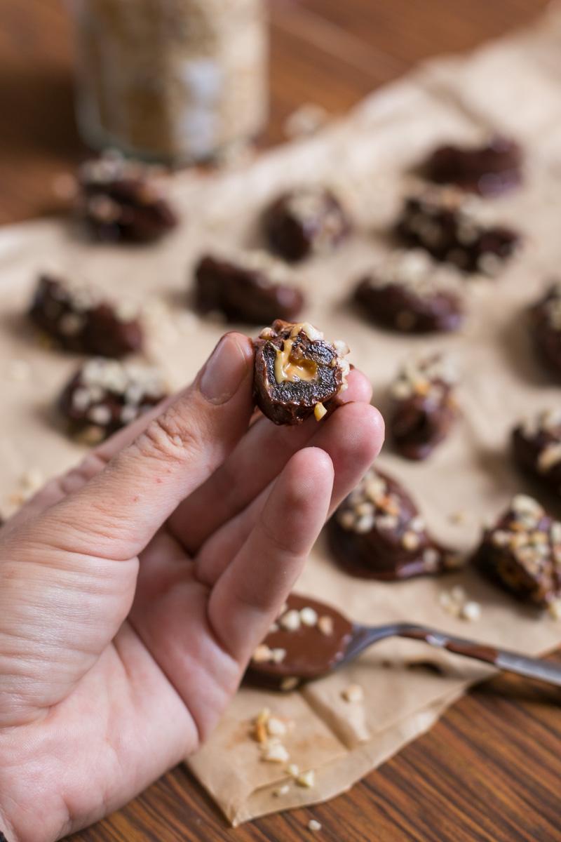 Bueno resulta que en esta preparación la textura y el dulzor de los dátiles evoca a la del turrón con caramelo (base del snicker), y al mezclarla con mantequilla de maní, agregarle almendras trituradas y cubrirlos de chocolate, paf! tenemos en nuestra manos a lo que yo le llamo “snicker saludable hecho en casa”.