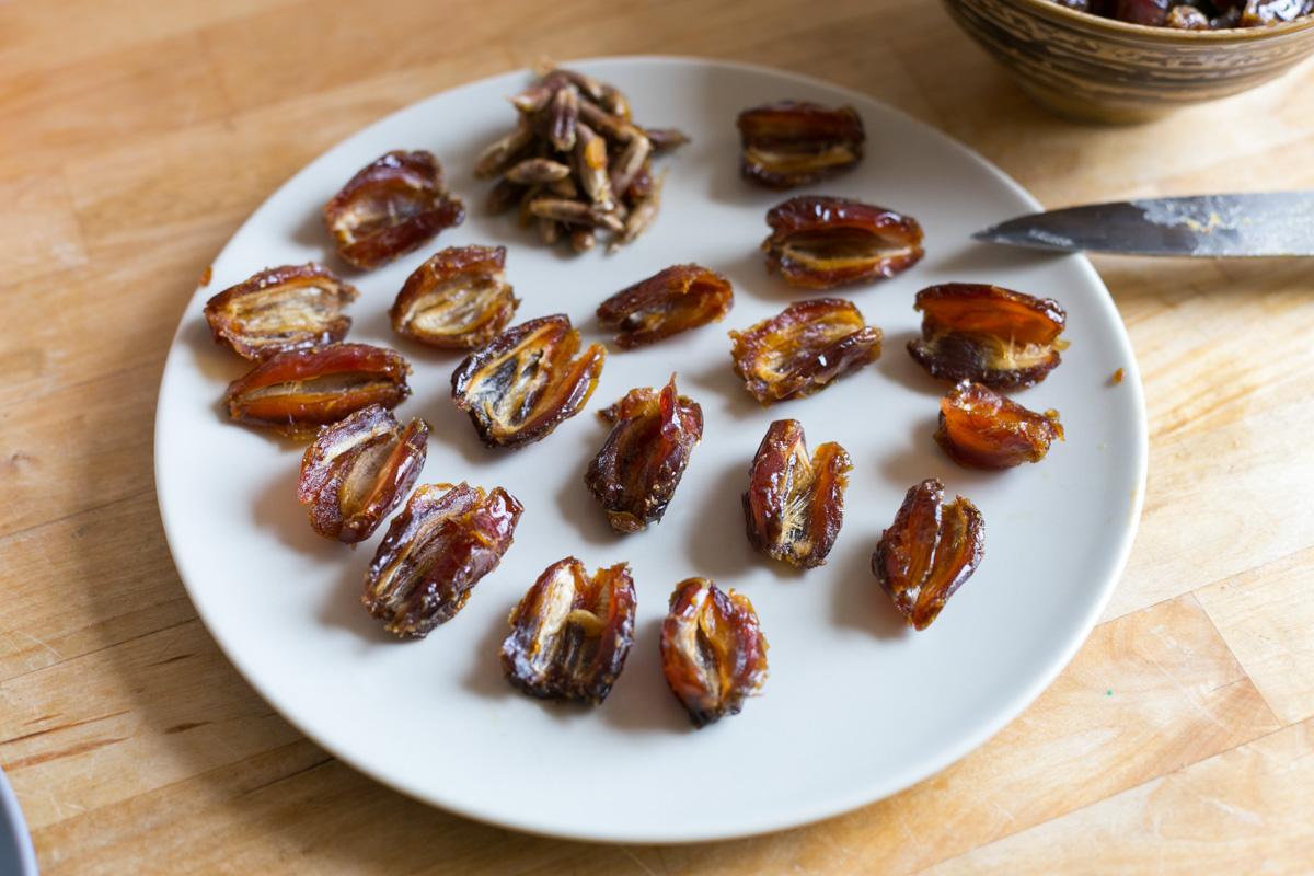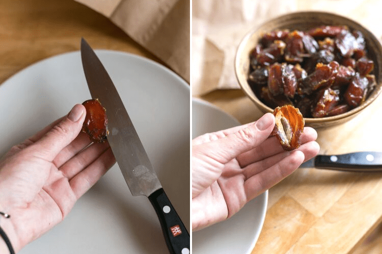 Abrir los dátiles con la ayuda de un cuchillo (solo por un lado y sin abrirlos completamente) y sacar el hueso.