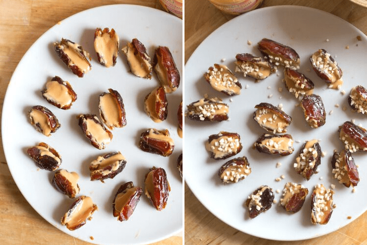 Llenar cada uno con aprox 1 cdta de mantequilla de maní y almendras trituradas.
