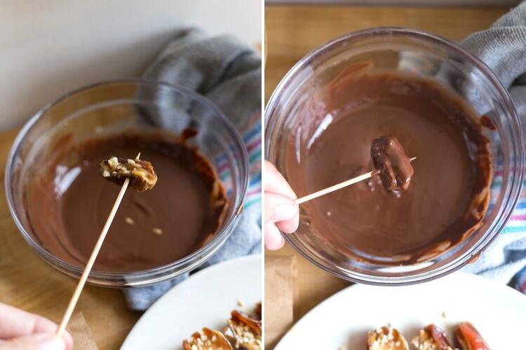 Atravesar un palillo (para brochetas) y sumergir cada dátil relleno en el chocolate. Colocar sobre un plato o fuente con cuidado y quitando el palillo. Yo me ayudo con otro palillo para manipularlos.