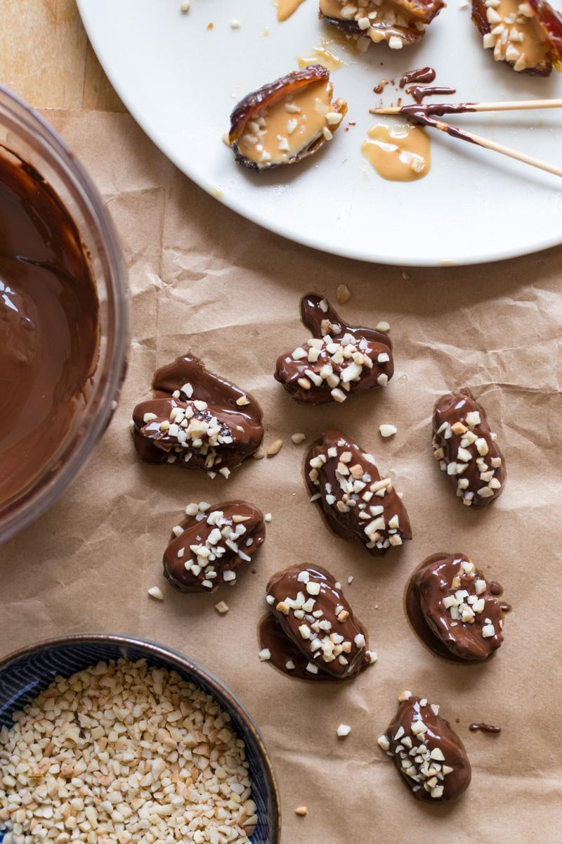 Si ven estas fotos seguramente se les viene todo a la cabeza menos saludable. ¡Sorpresa! estos dátiles rellenos de mantequilla de maní con cobertura de chocolate son un snack bastante saludable (bajos en azúcar y ricos en energía) que están elaborados en base a ingredientes naturales como el dátil, la mantequilla de maní (cacahuate) y chocolate con alto porcentaje de cacao.El dátil es un fruto se que obtiene de la palmera datilera. Su cultivo y uso culinario es muy popular en los países árabes de la parte occidental, siendo Irán e Irak los mayores productores (En California también hay un cultivo bastante grande). Su nombre viene de la palabra griega daktilos δακτύλος que significa “dedo”. Hay muchas variedades, entre las que encontramos Zahid, Medjool, kadrawi y Sukkari, siendo esta última la más apreciada. (Fuente Wikipedia)