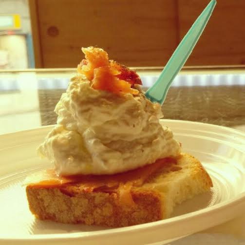 Es un puestecito que hay dentro del Mercado de San Miguel, solo venden tostas de burrata. Las podéis pedir con salmón, jamón, pesto,etc...