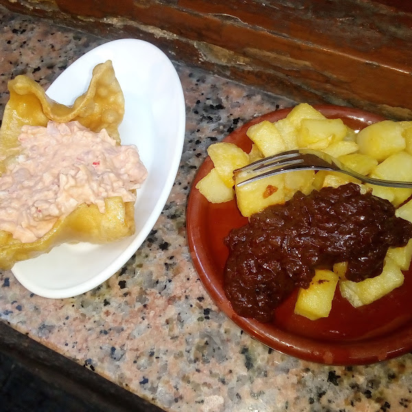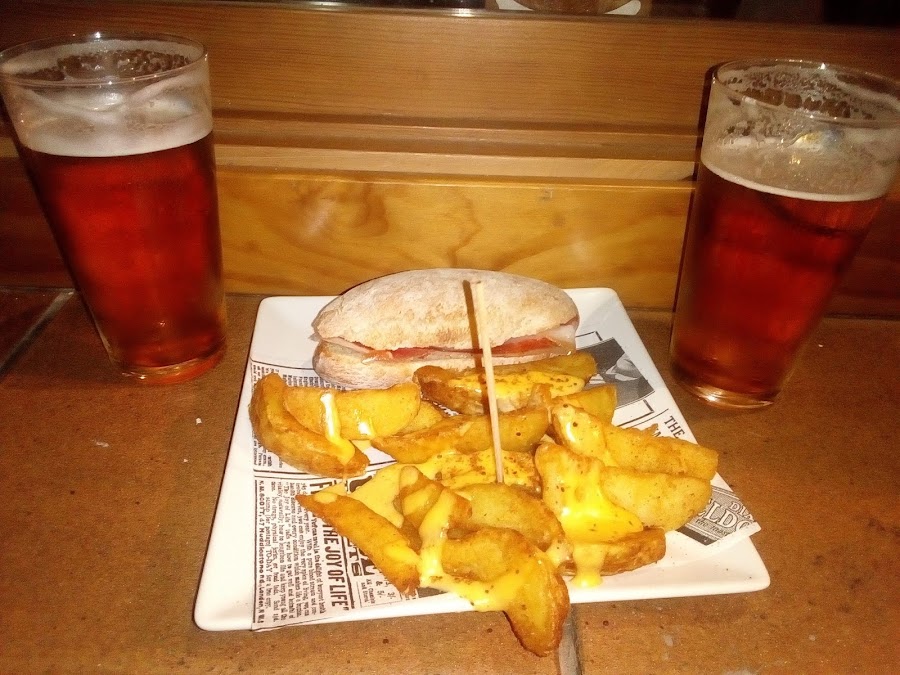 Desde aquí nos dirigimos al Entrecalles, en este sí que triunfamos, incluso volvimos al día siguiente. En este establecimiento su tapa estrella son las patatas gajo con crema de queso y polvo de cecina y la verdad es que estaban deliciosas, luego pedimos una pulga y la verdad es que el relleno era un poco escaso, pero os recomiendo que busquéis este bar simplemente para probar sus patatas.