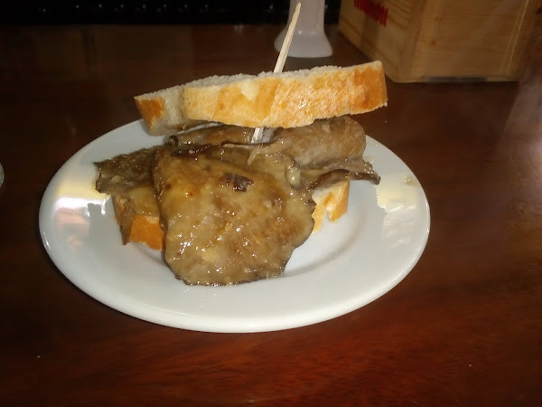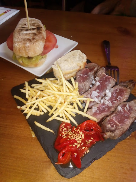 Hablando de carne una de mis grandes debilidades es el Chuletón, en la Taberna del Tío Blas hacen uno de muerte como casi todos sus pinchos, pero como es un poco caro, esta vez decidimos probarlo también en la Taberna Correos, que cuesta la mitad de precio y la verdad es que estaba bueno, pero no tenía nada que ver la carne ni en textura ni en sabor, encima a nosotros a la mesa nos llegó un poco frío. Las patatas que le acompañan son paja en vez de caseras y los pimientos son rojos en vez de padrón, es decir que por el precio está bien, pero no son buenas las comparaciones. Eso sí en este bar os recomiendo el montado compuesto por anchoa, tomate y guacamole en pan de cristal que estaba de lujo.