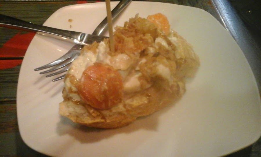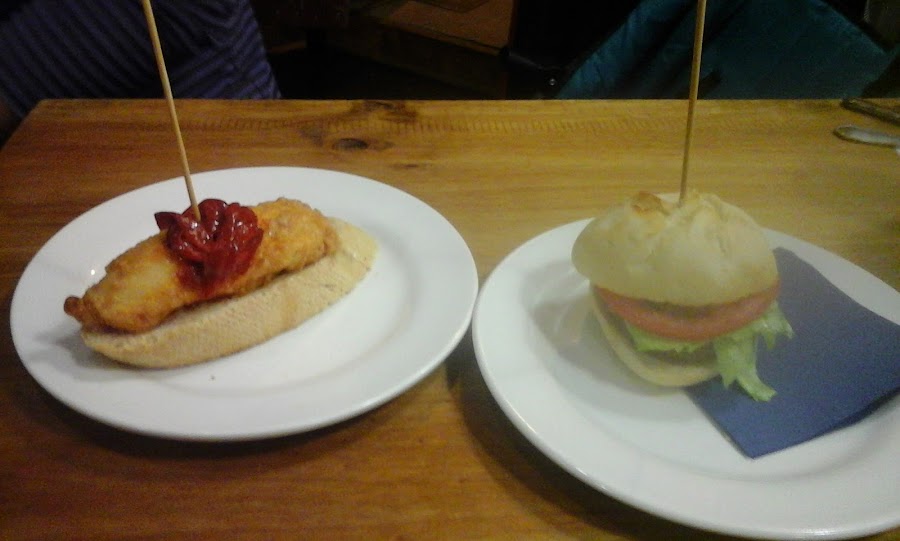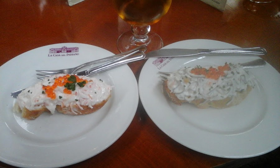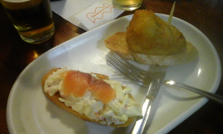 A continuación, decidimos acercarnos al Mesón Rampalay en la calle Daoiz y Velarde, la verdad es que había bastante gente y los pinchos estaban ricos. Por 5,90 euros degustamos dos cañas y un pimiento relleno y rebozado de bechamel y gamas y un pinchos de ensaladilla de manzana y salmón ahumado. Ambos eran muy suaves, pero se podían degustar los ingredientes que llevaban cada uno de ellos.
