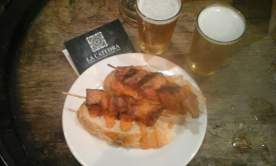 Otro de los lugares típicos para tomar pinchos en Santander es el local La Catedra, se encuentra en la calle del Medio, número 5. Nosotros probamos el pincho del día con una mini caña por tres euros y la verdad es que nos sirvieron un pincho moruno con una salsa que estaba muy rico.