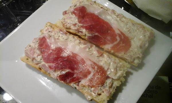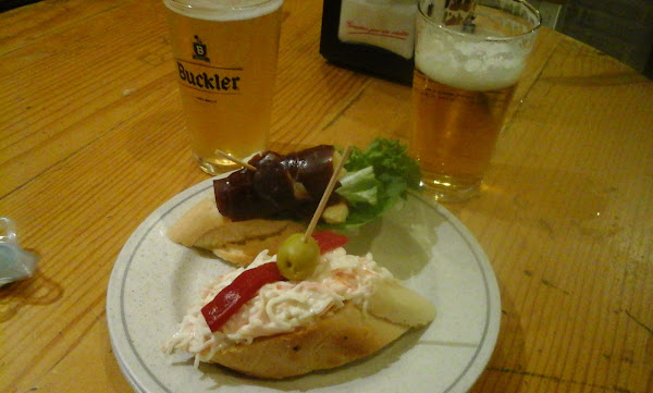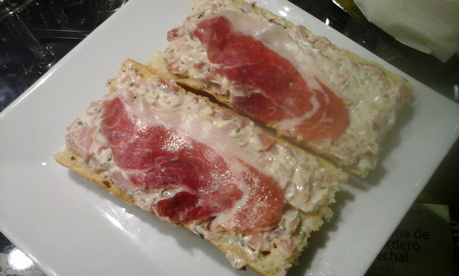 Voy a comenzar por uno de los lugares que más me gustaron y por un pincho excepcional, que lo recree ayer en el blog. Se trata del bar jamonería Sarmiento, que se encuentra en la calle Conde Ansúrez, 11. Es un local pequeño, pero muy acogedor y los pinchos y pulgas más demandados son los compuestos de jamón. Nosotros tal y como os comenté ayer pedimos dos pinchos de lacon y jamón con salsa holandesa que estaban de muerte. Además, allí podéis comprar embutido y queso, aunque os aconsejo que lo hagáis en otro lugar y os ahorraréis unos euros. Por las dos cañas y las dos tostas nos cobraron 6,80 euros.