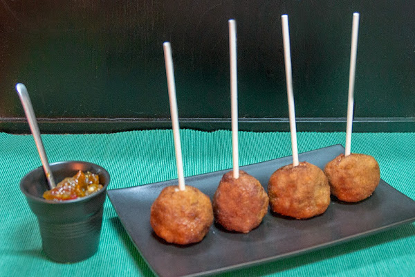 Sacamos dejamos enfriar y ponemos los palos. Acompañamos de la mermelada de pimientos.