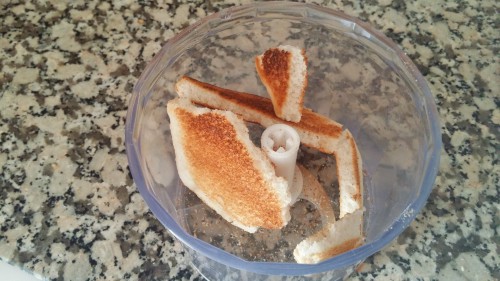 Se tritura el pan de molde. Se trituran las aceitunas.