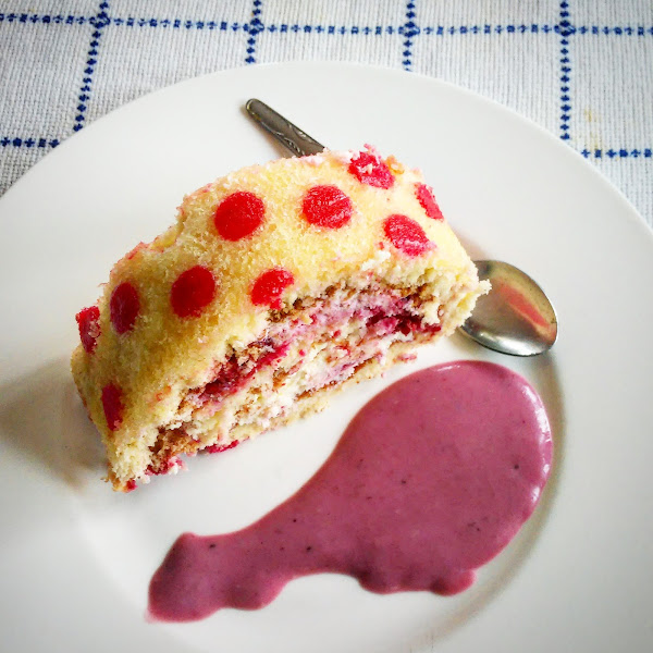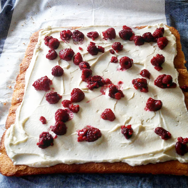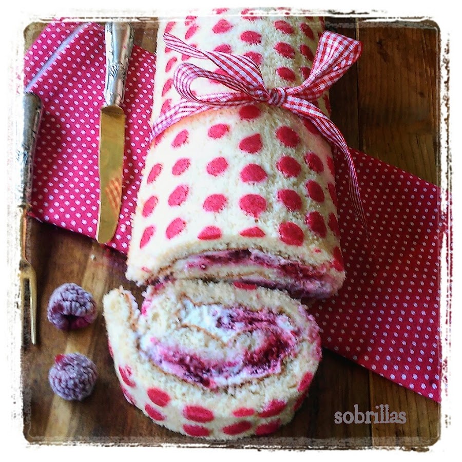 Desenrollamos nuestro genovés y untamos con la mermelada y sobre ella la mezcla de queso y por último las frambuesas.