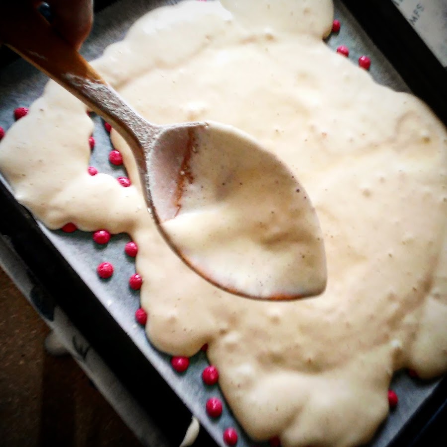 Sacamos nuestra decoración del congelador y vertemos la mezcla de bizcocho. Horneamos a 200ºC unos 8 minutos.