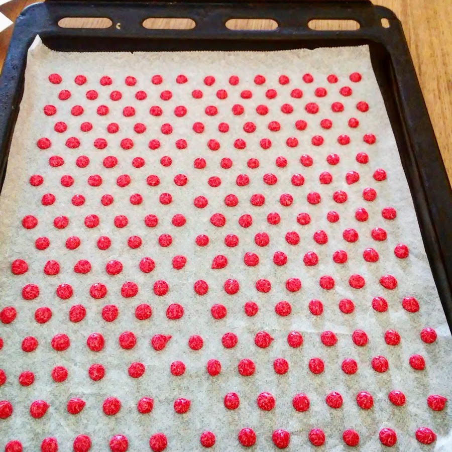 Colocamos nuestra plantilla sobre la placa de horno y encima papel de horno. Decoramos y llevamos la lámina al congelador mientras hacemos el Bizcocho genovés.