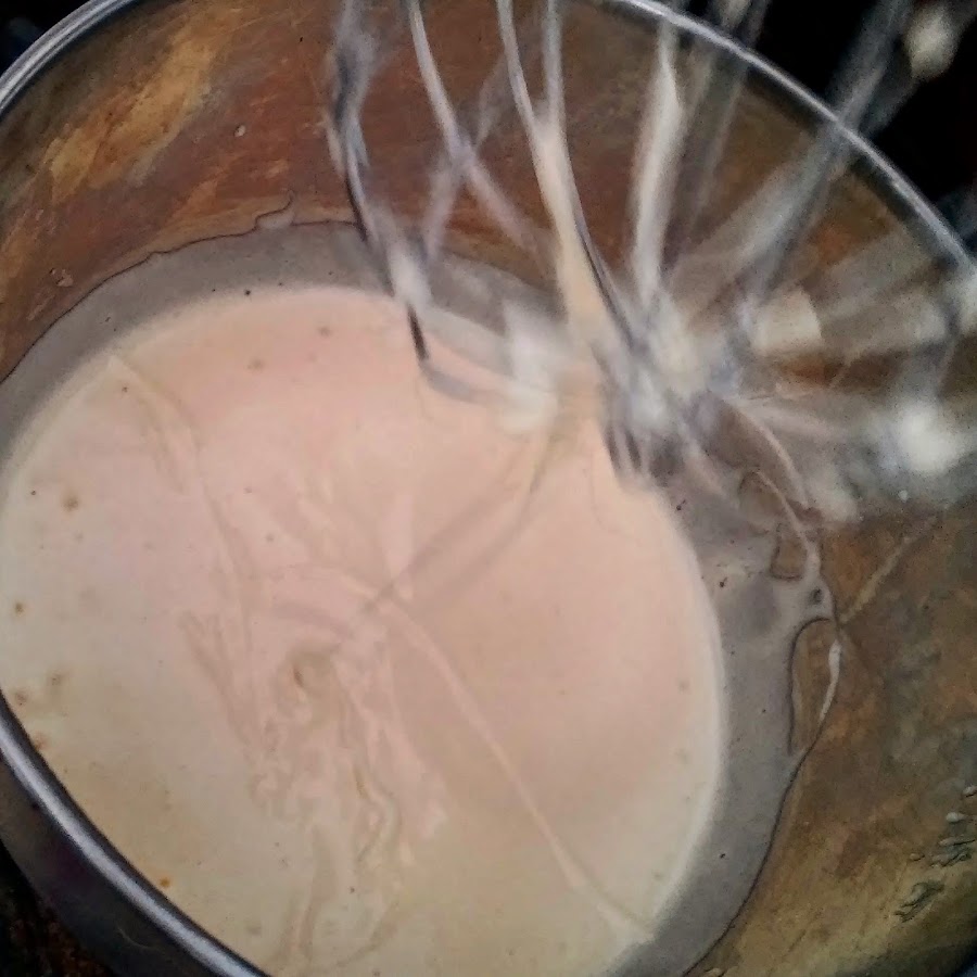 Preparamos el relleno: Batimos la nata (crema de leche) ligeramente y a ésta le añadimos el queso mascarpone y un par de cucharada de azúcar.