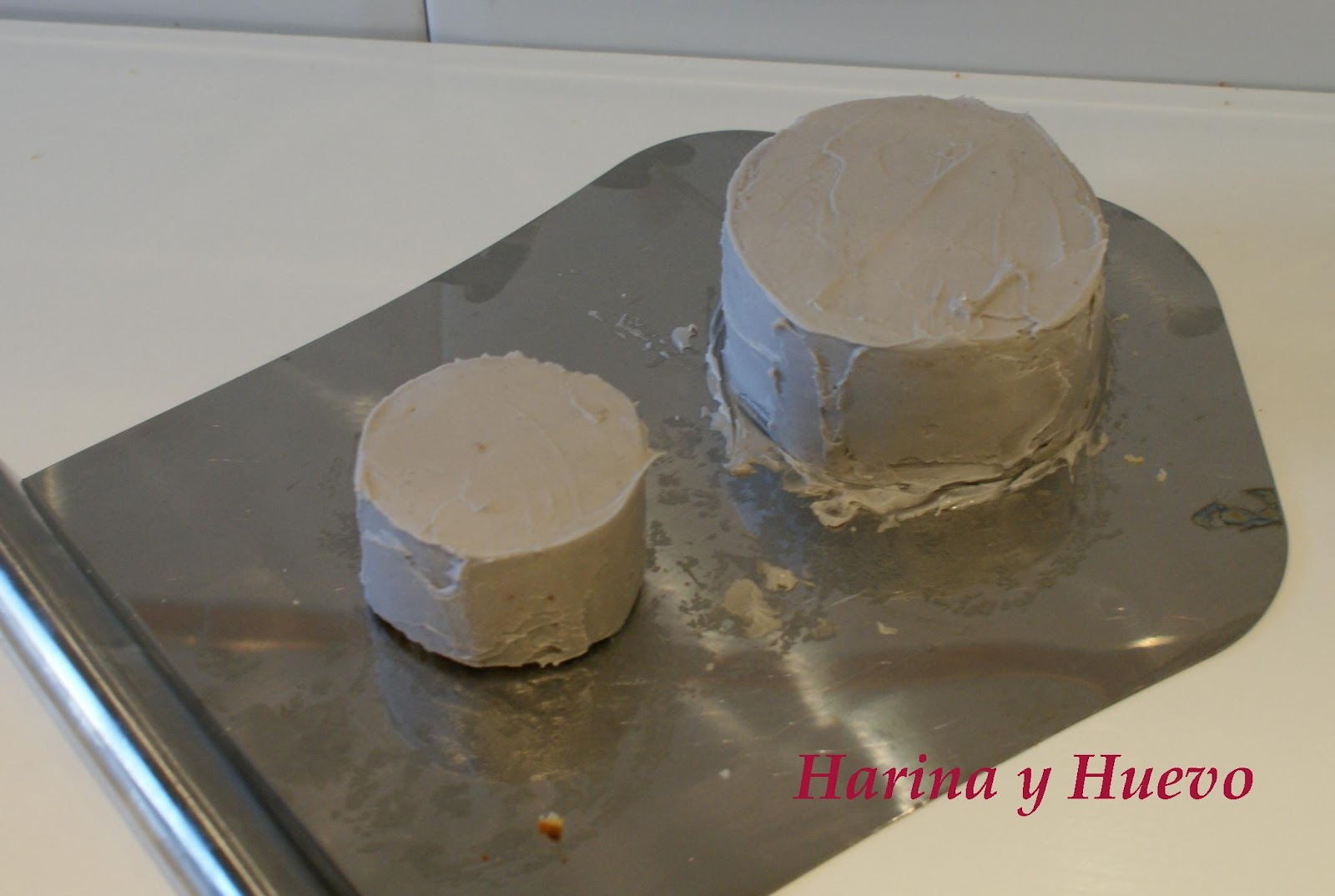 Una vez que tenemos los dos bizcochos fríos los vamos a cubrir con el buttercream de violetas, en mi caso como es una minitarta no hace falta rellenarla porque ya el buttercream de fuera es suficiente pero si hacéis una tarta grande mejor la rellenáis también.