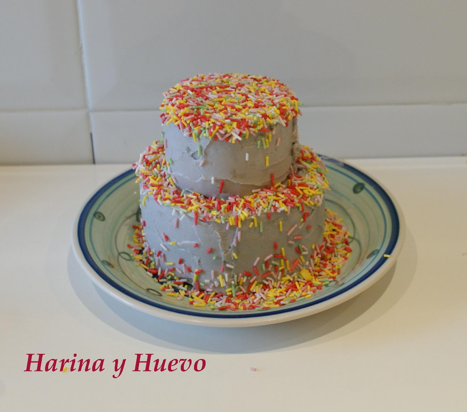 ¡Y ya podemos empezar a echar los sprinkles! colocamos la tarta en un plato de manera que los que no se peguen se puedan reutilizar. Para pegarlos empezamos echando por la parte de arriba, luego vamos inclinando el plato y echando por lo lados.