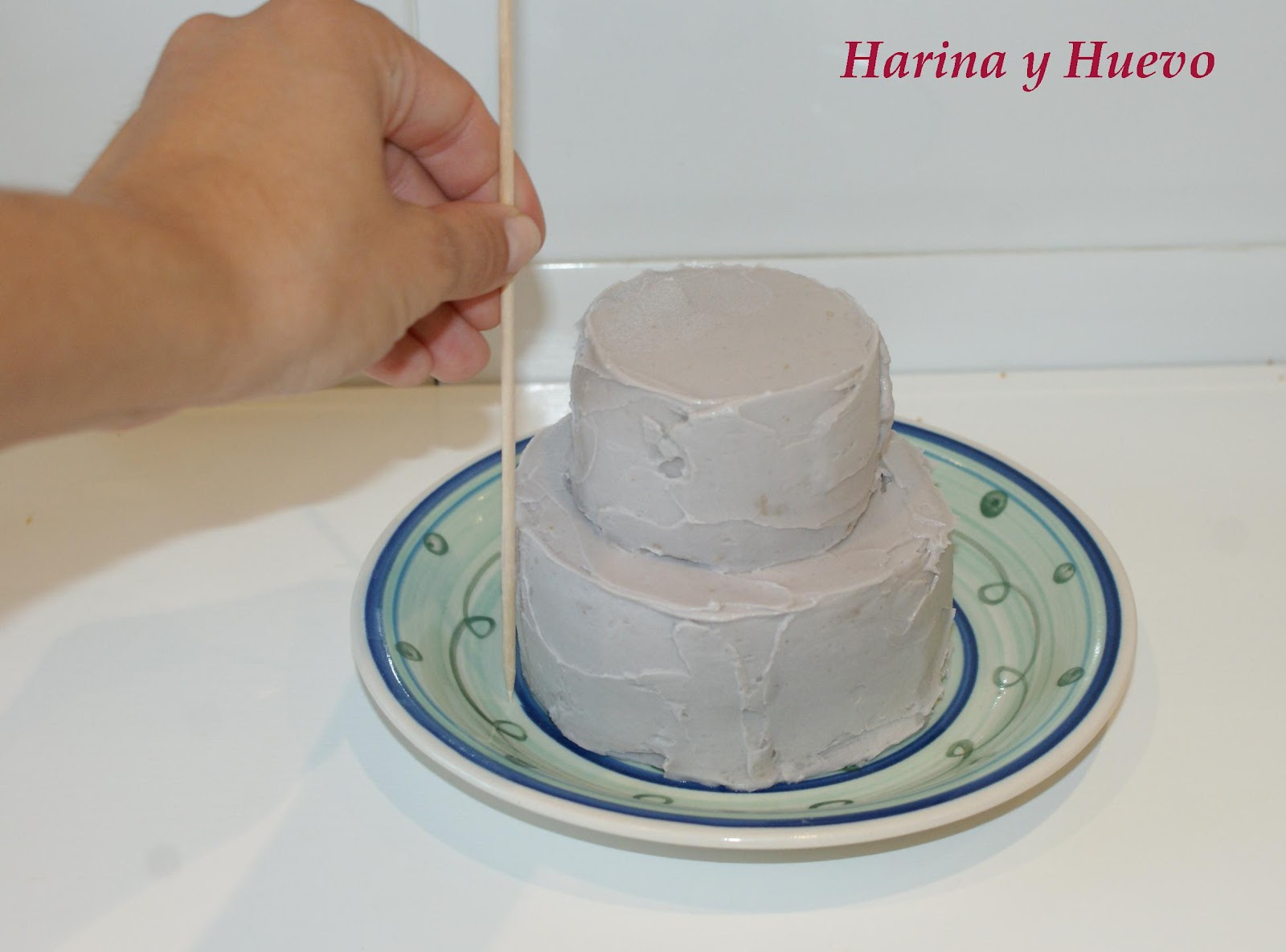 Ahora colocamos un bizcocho encima de otro, procurando que están centrados, y para que no se mueva clavamos un palo de brocheta: medimos la altura, lo cortamos y lo insertamos en el centro. El agujerito que queda lo cubrimos con más buttercream.