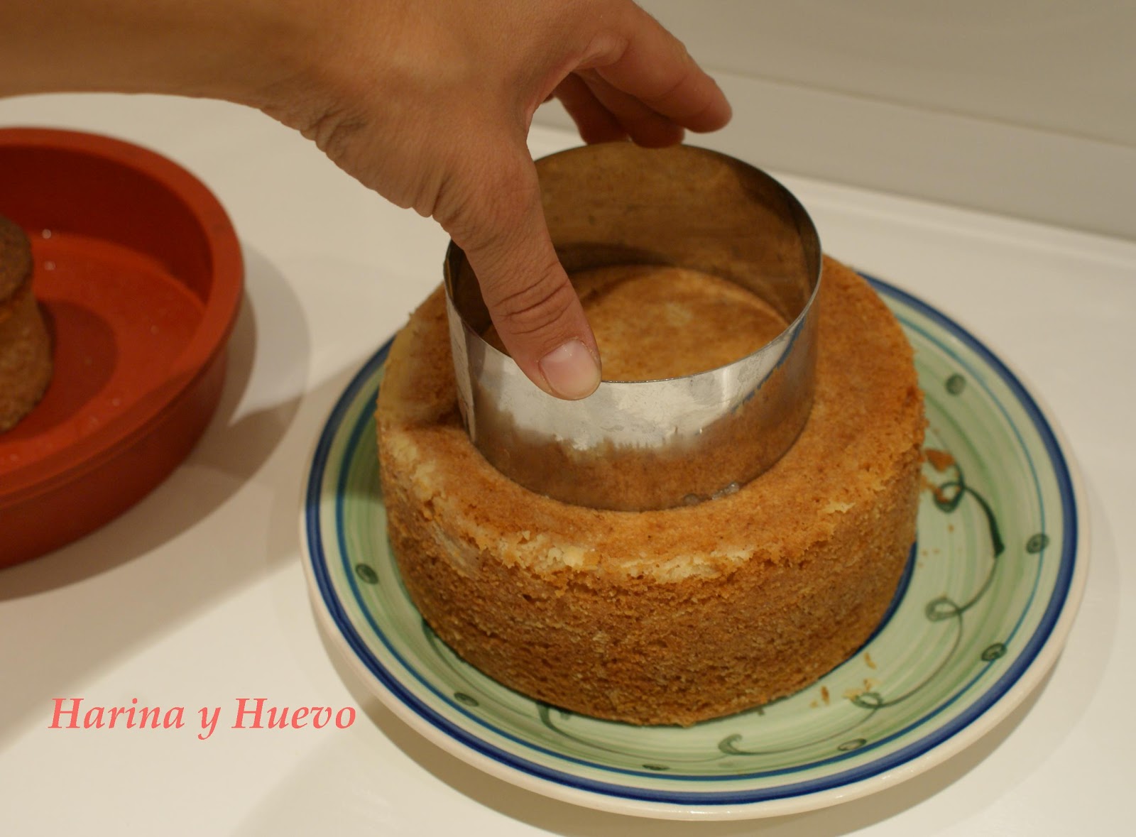 Para hacer la mini tarta de dos pisos vais a necesitar, como es lógico, dos bizcochos. Si no tenéis moldes pequeños no os preocupéis porque os enseño dos formar de hacerlo usando aros de emplatar:Colocamos el aro de emplatar sobre un molde más grande. Untamos con mantequilla y harina para que no se pegue, colocamos la masa dentro y horneamos. Ventajas: Si solo queremos uno usamos la masa justa. Inconvenientes: no vale para masas muy líquida.