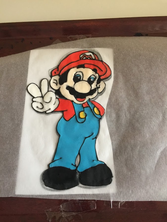 Lo primero que preparé con antelación es el dibujo de Mario Bros, que lo hice con Glasa Real(Royal Icing), para que se secara por completo.