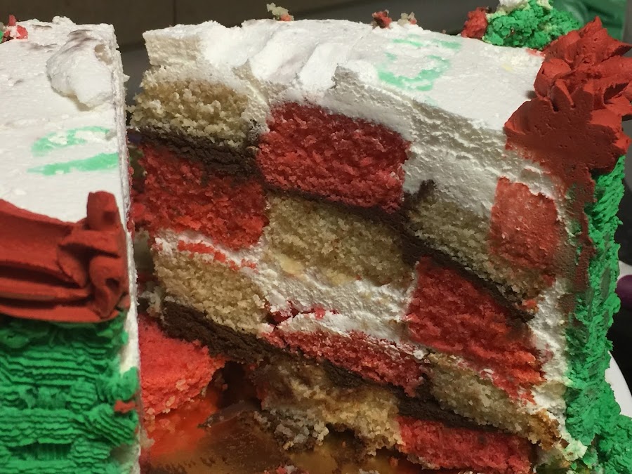 La noche antes de la fiesta preparé el bizcocho, en este caso utilice la técnica ajedrez, para que al cortar quedara en cuadros las capas de bizcocho.